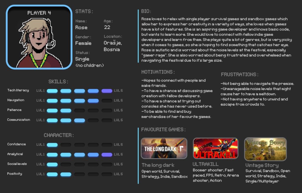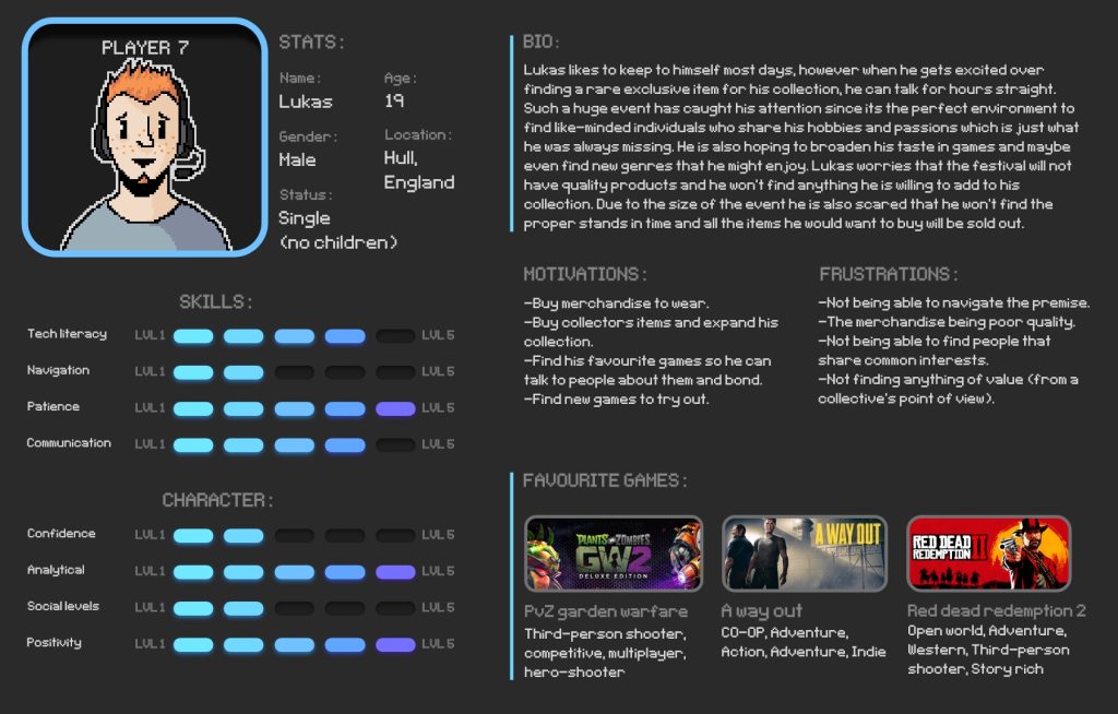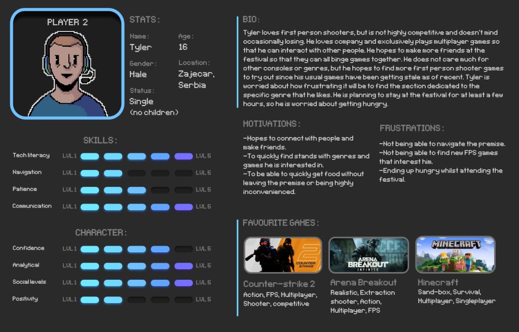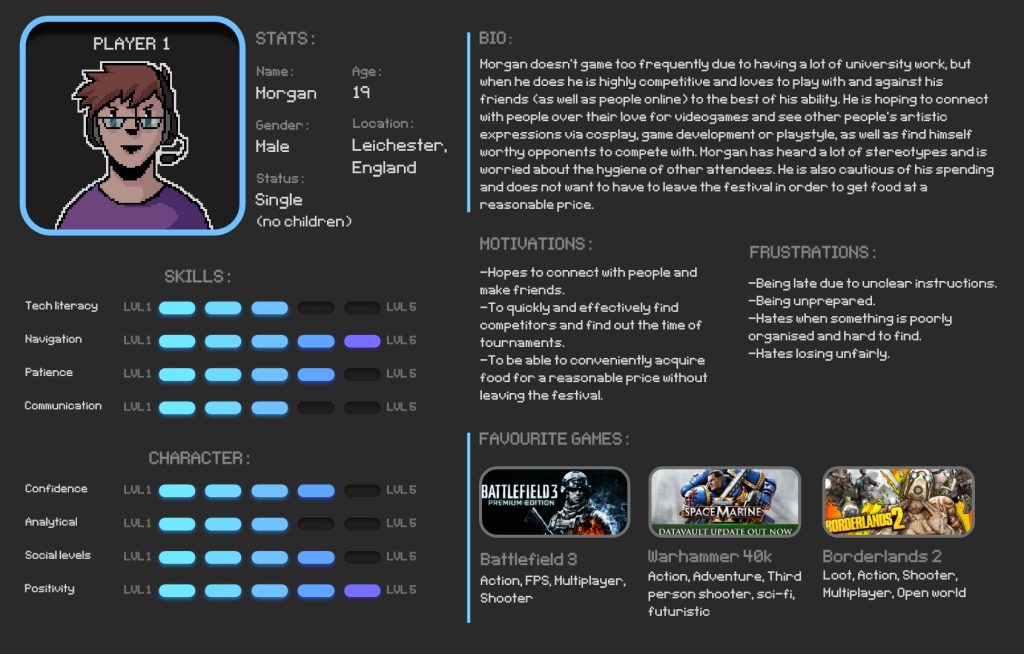 These personas allow me to simulate the accurate target audience of a gaming festival consisting of people who enjoy video games and large communities. In order to better understand the target audience, I have compiled a few questions for the possible attendees and have given their answers to personas for anonymity, their answers are crucial to the development of the website since it gives me first hand insight on their user needs and for me to work off of their concerns and add accessibility features that I would of otherwise not thought of.
