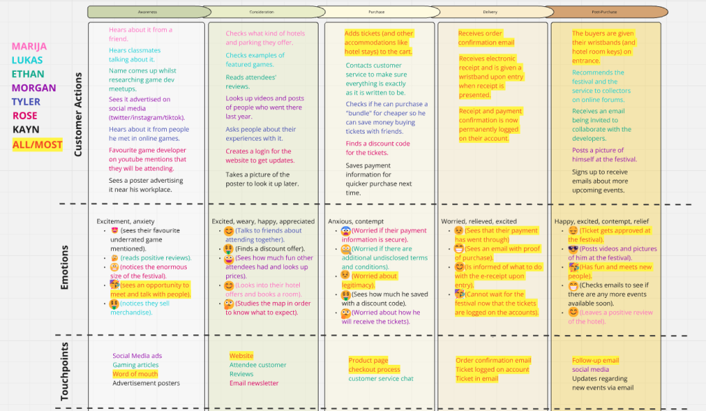 In order to better understand the thought process of my users, I have created this journey map and considered every possible issue/interaction that a user will be exposed to and their reactions to it. This helped me get insight and consider what should be prioritised based on the user needs and create the desired user experience for all customer archetypes as well as think of unique ideas to work around obstacles.
