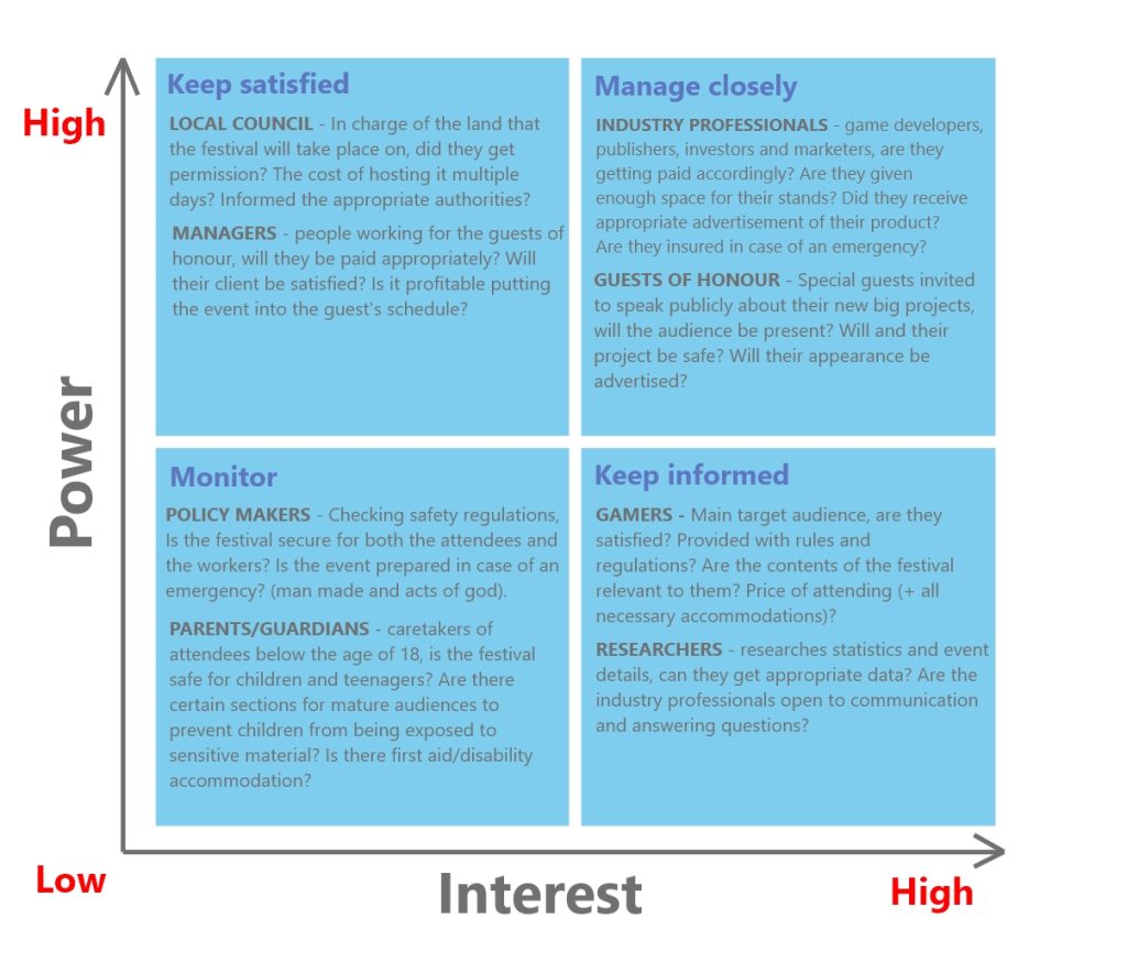 The festival features a variety of stakeholders each with different goals and needs. Whilst creating my website I have to keep them in mind especially the ones that hold a lot of power over this project. The stakeholders table is used to categorise the stakeholders in order of importance, and identify which groups are most interested to be engaged with your project and which hold the most power and/or influence over it.