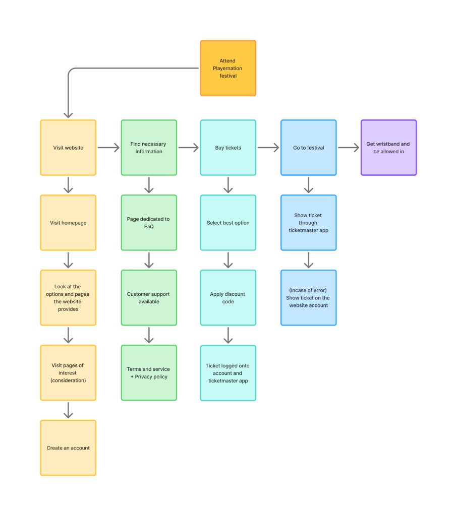 The core of my user’s needs for the website are to be able to successfully purchase tickets, have their ticket/purchase receipt quickly accessible, book hotel stays, know where to acquire food or any additional tools to help with their needs (i.e disability aid, first aid, etc), quickly and efficiently be provided with any information they need surrounding the festival. All of these features need to be a straightforward process for people regardless of their tech literacy or navigation skills in order to accommodate as many people as possible. The most common concerns all regard not being able to navigate the premise and the fear of getting lost, which also means it might affect their website navigation skills too which I need to keep in mind when structuring every page, and especially the UI of the purchase pages.