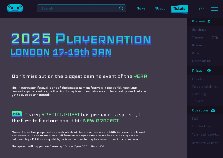I replicated the colour scheme of odyssey and make the highlights be very vibrant in comparison to the “dark mode” background in order to make it look more modern and less serious to demonstrate to the website visitors that this event is focused on fun and is meant to be relaxing and informal. I added a burger menu on the side in order to satisfy customer needs and make every option available for them from the start to make it easier to navigate the website.