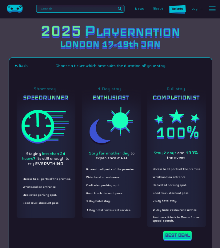 In order to make it more relatable for the users, I have named every ticket option after a type of player whilst relating it to the user’s goals for the festival. The speedrunner tier is for people that want to only stay at the festival for a small amount of time, finishing it all within 1 day. Enthusiast is for casual users who want to experience the festival according to their taste, and completionist is for people who want to experience every part of the festival. I have included a “best deal” label on the last option in order to slightly encourage larger purchases whilst still caring about the best interests of the customer. Every option has their own respected visuals which give you an idea of what the option has to offer before you read it.