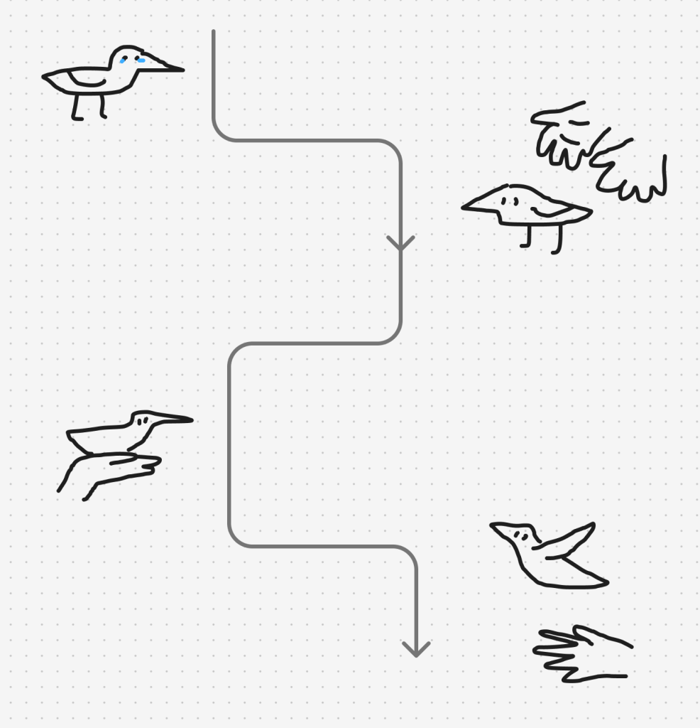 This draft expands on my initial idea to base it off of the “nuggets” short. Though instead of spiralling deeper, the bird would be helped instead.