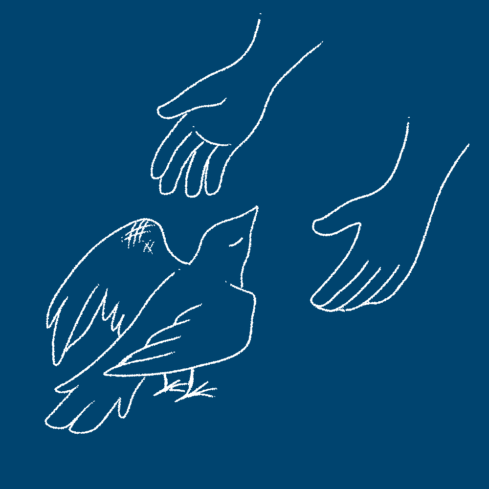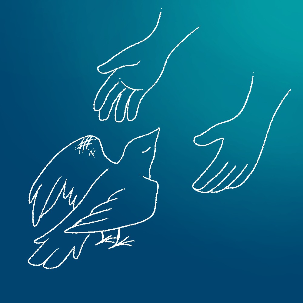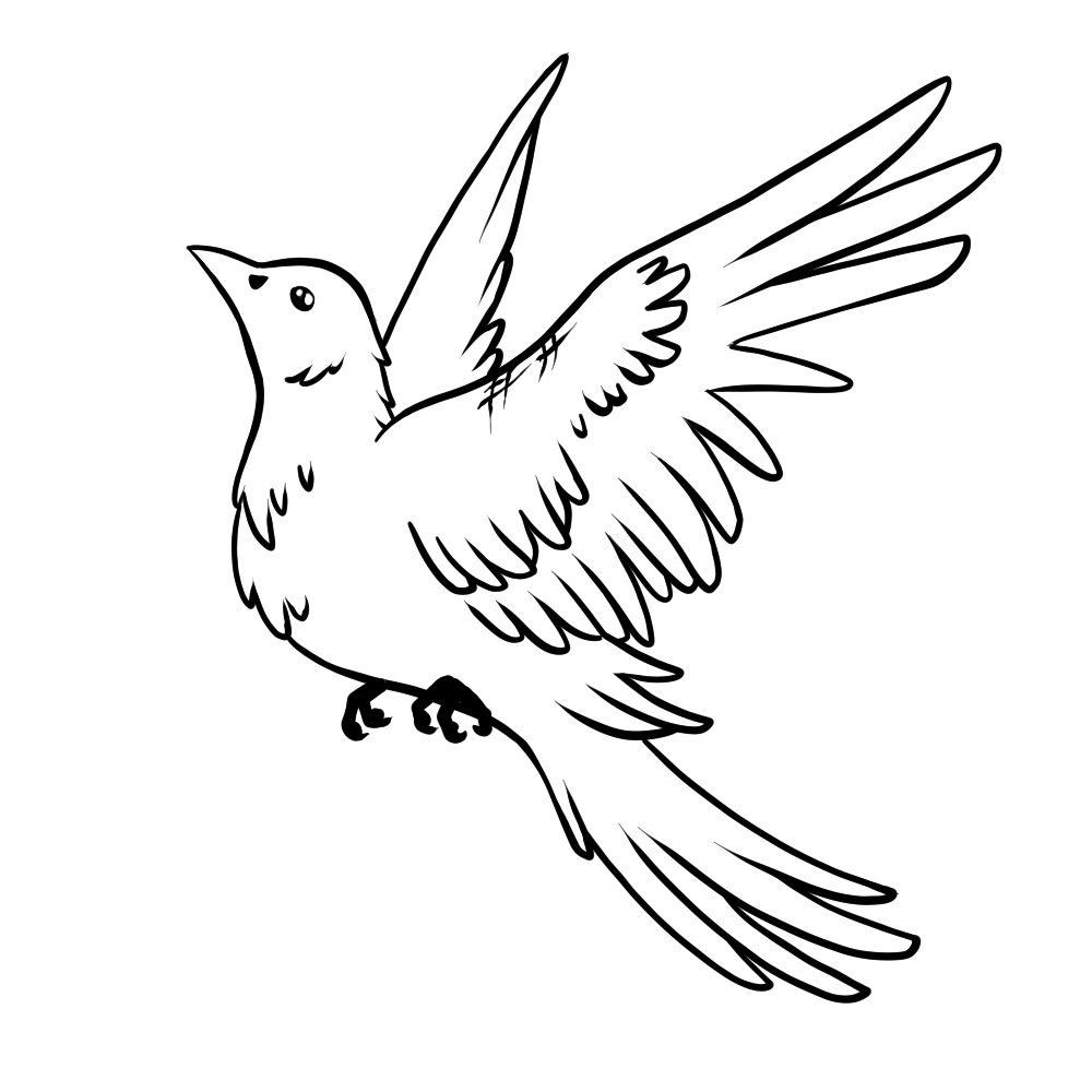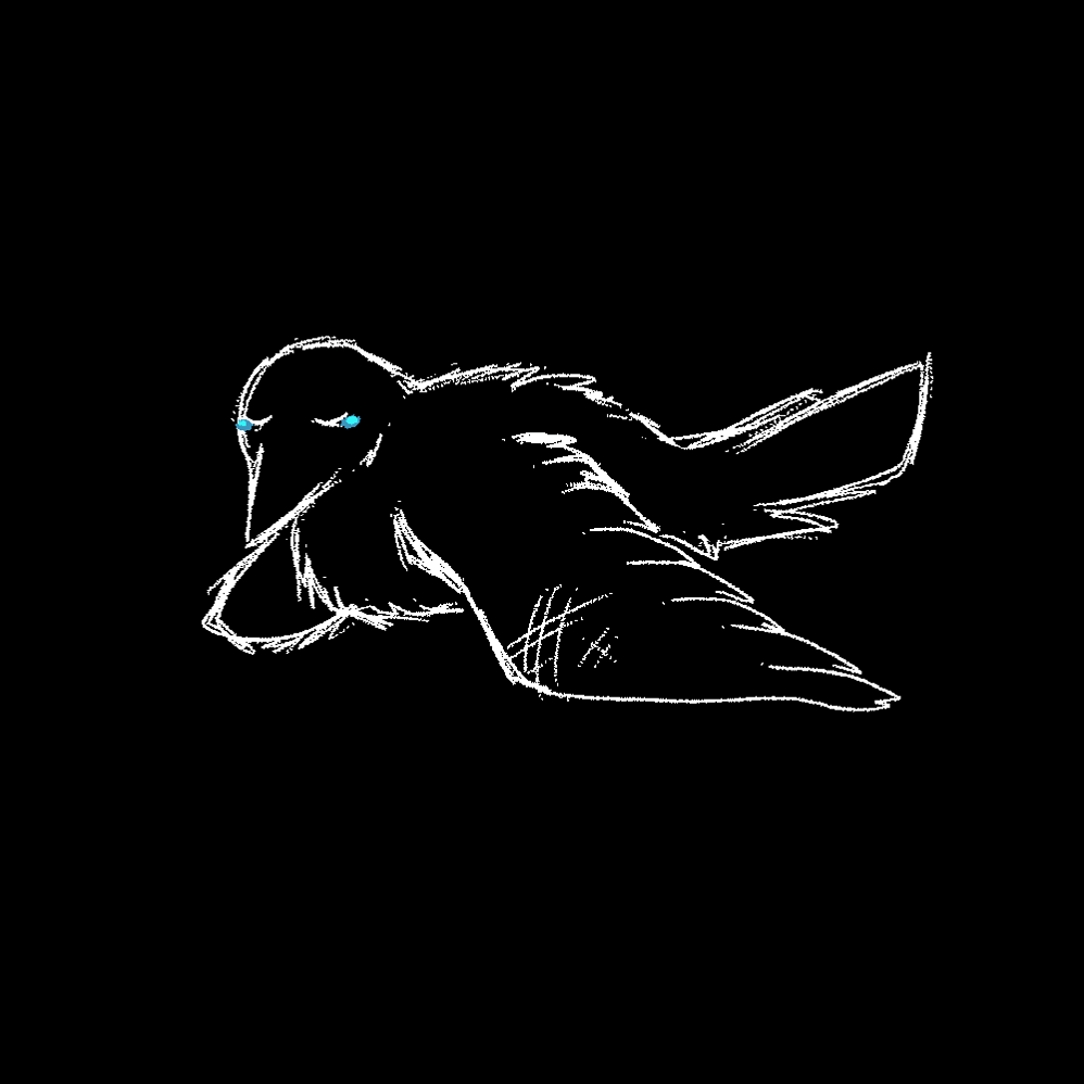 The melancholy blue makes sure that it is clear the conflict is still not resolved, yet is an upgrade from the prior black void. The lines became a bit cleaner and more composed, hinting at better emotional regulation when presented with support. I have made 2 different versions, 1 with a plain background and 1 with a slight gradient. The gradient helps to represent what exactly is going to bring light back to the bird (that being the support system that the PC provides), however I was not sure how I would be able to integrate it, so I made a solid colour version just in case.
