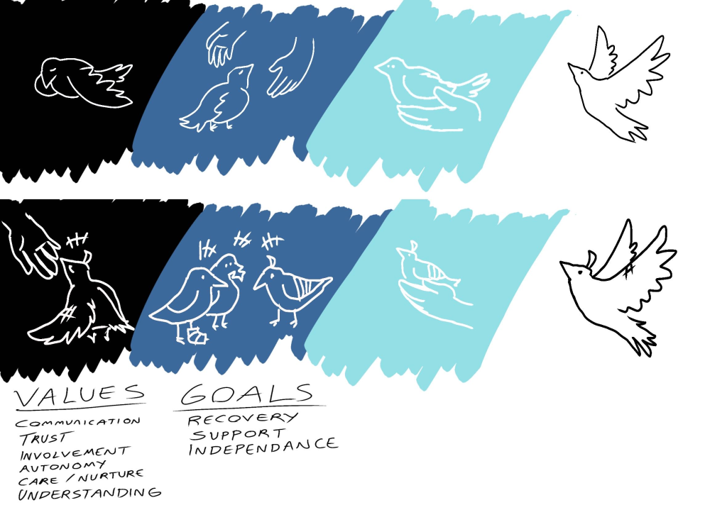 The first one is simple, and very versatile. It is vague and easy to relate to whilst showcasing the process of recovery with support. However due to how vague it is, it might be difficult to showcase the values through it. The second is is more complicated and less vague, it has clear imagery which can speak more directly to the user, which I can utilise and